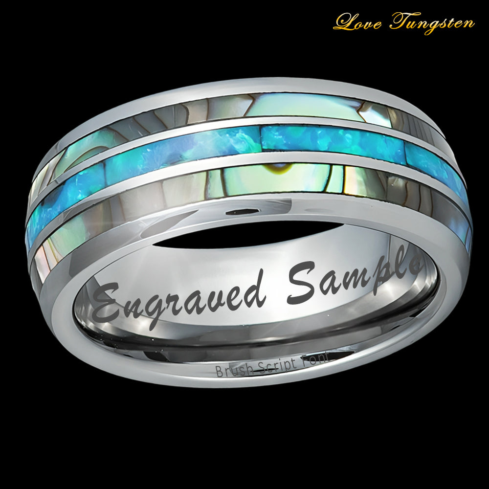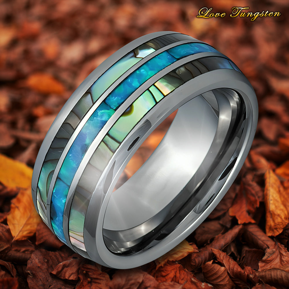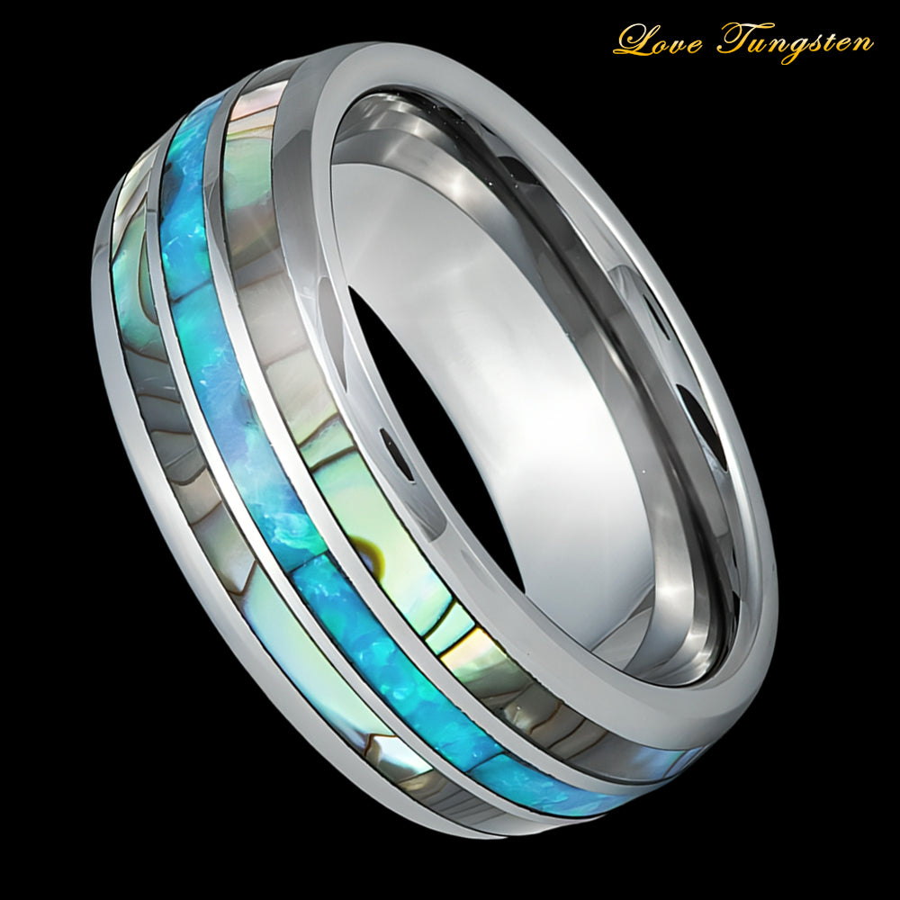 Opal & Mother of Pearl Inlay Domed Tungsten Ring - 8mm | Elegant & Timeless