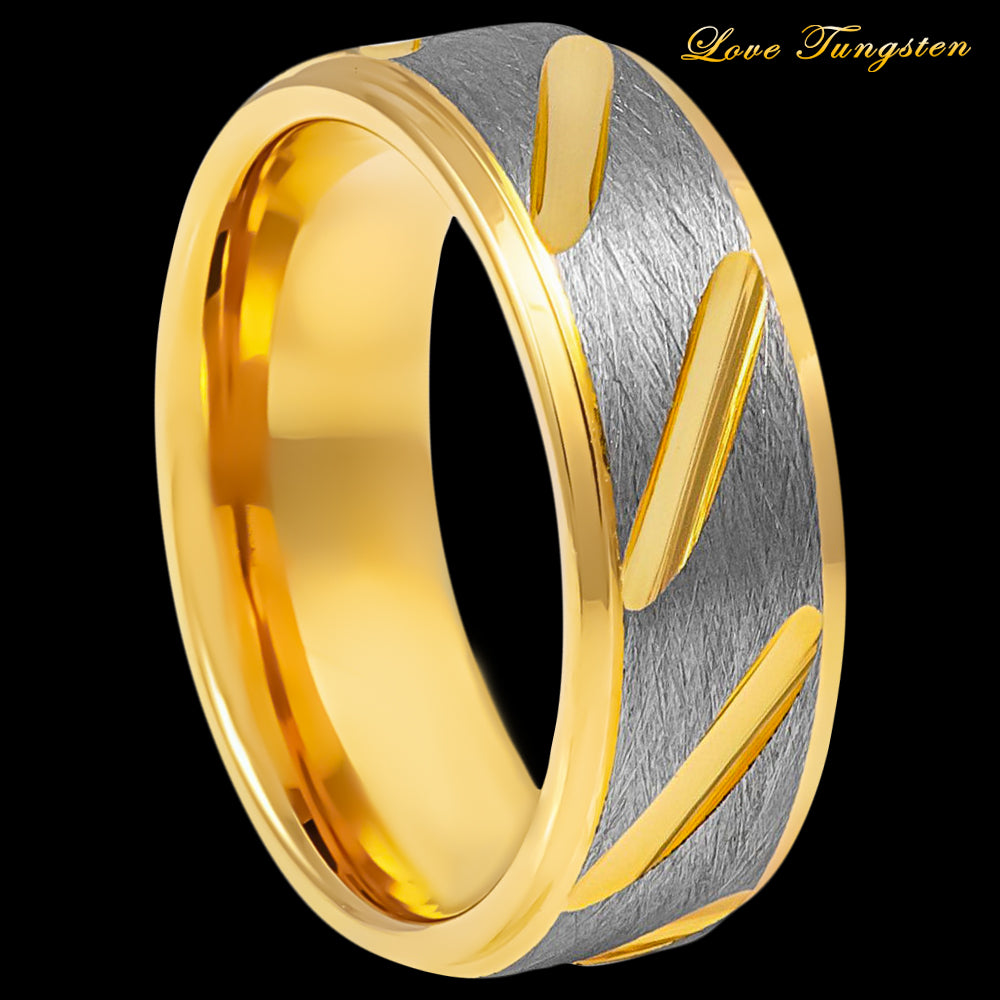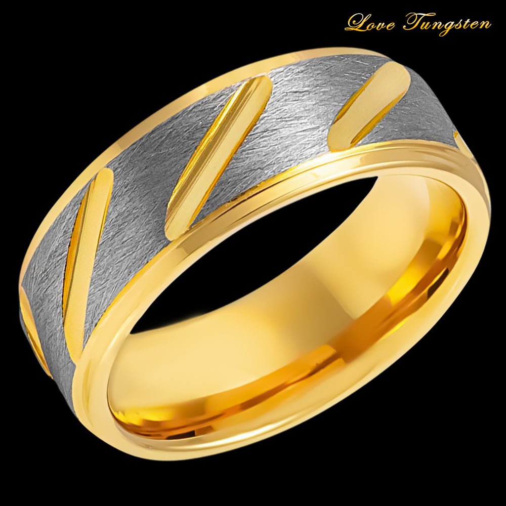Two-tone Gray & Yellow IP Plated Notched Tungsten Ring – 8mm | Love Tungsten