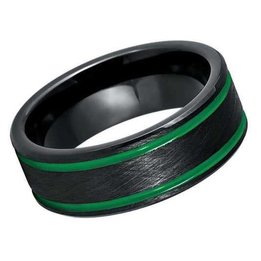 Double Green Stripes Black IP Ice Finish Tungsten Ring - 8mm