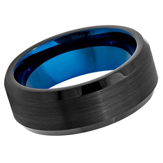 Black Outside, Blue Inside IP Plated Brushed Beveled Edge Tungsten Ring - 8 mm