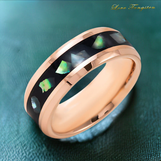 Black Resin & Abalone Shell Inlay with Rose Gold IP Tungsten Ring - 8 mm