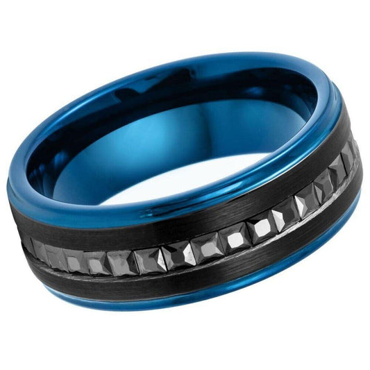 Black CZ Princess Cut Eternity Blue Edges Black IP Plated Tungsten Ring – 8mm