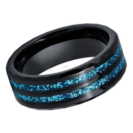 Faceted Finish Blue Glitter Inlay Black IP Plated Tungsten Ring - 8mm