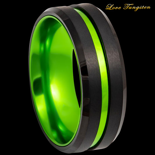 Green Center Grooved with Anodized Aluminum Sleeve Black IP Plated Tungsten Ring – 8mm