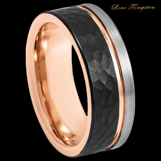 Rose Gold Plated, Black & Silver IP Plated Grooved Center Tungsten Ring - 8mm