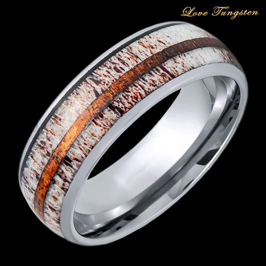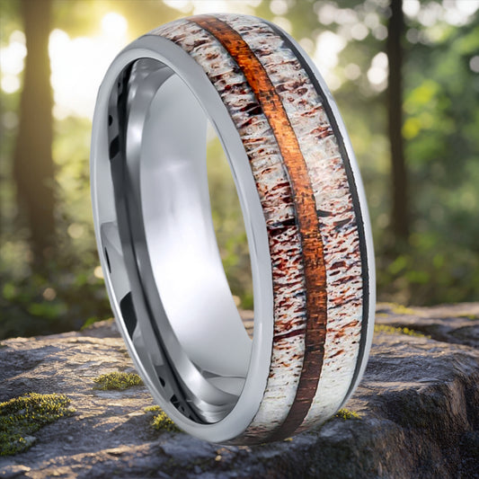 Deer Antler & Whiskey Barrel Strip Silver Inlay 8mm Hunter's Tungsten Ring