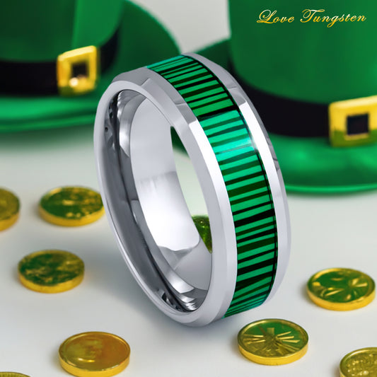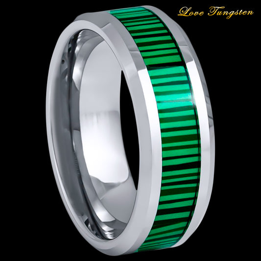 Silver Green Beveled Edge Faux Malachite Inlay Tungsten Ring - 8mm