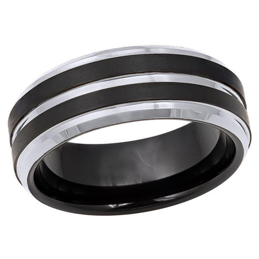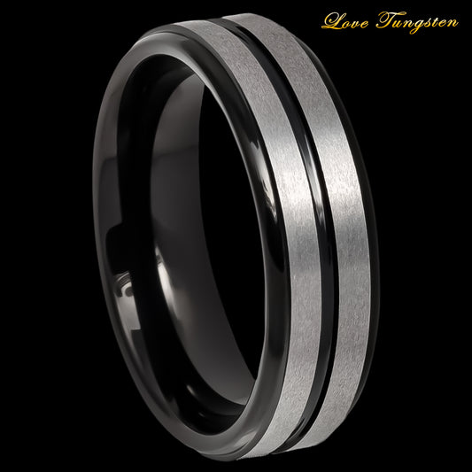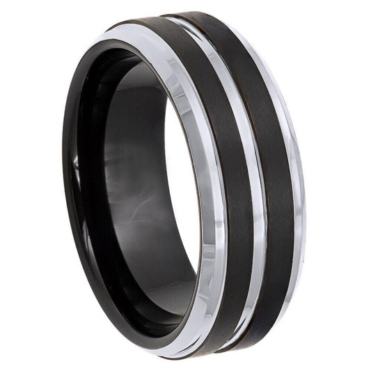 Two-tone Black IP Brushed Center Beveled Edge Tungsten Ring - 8mm