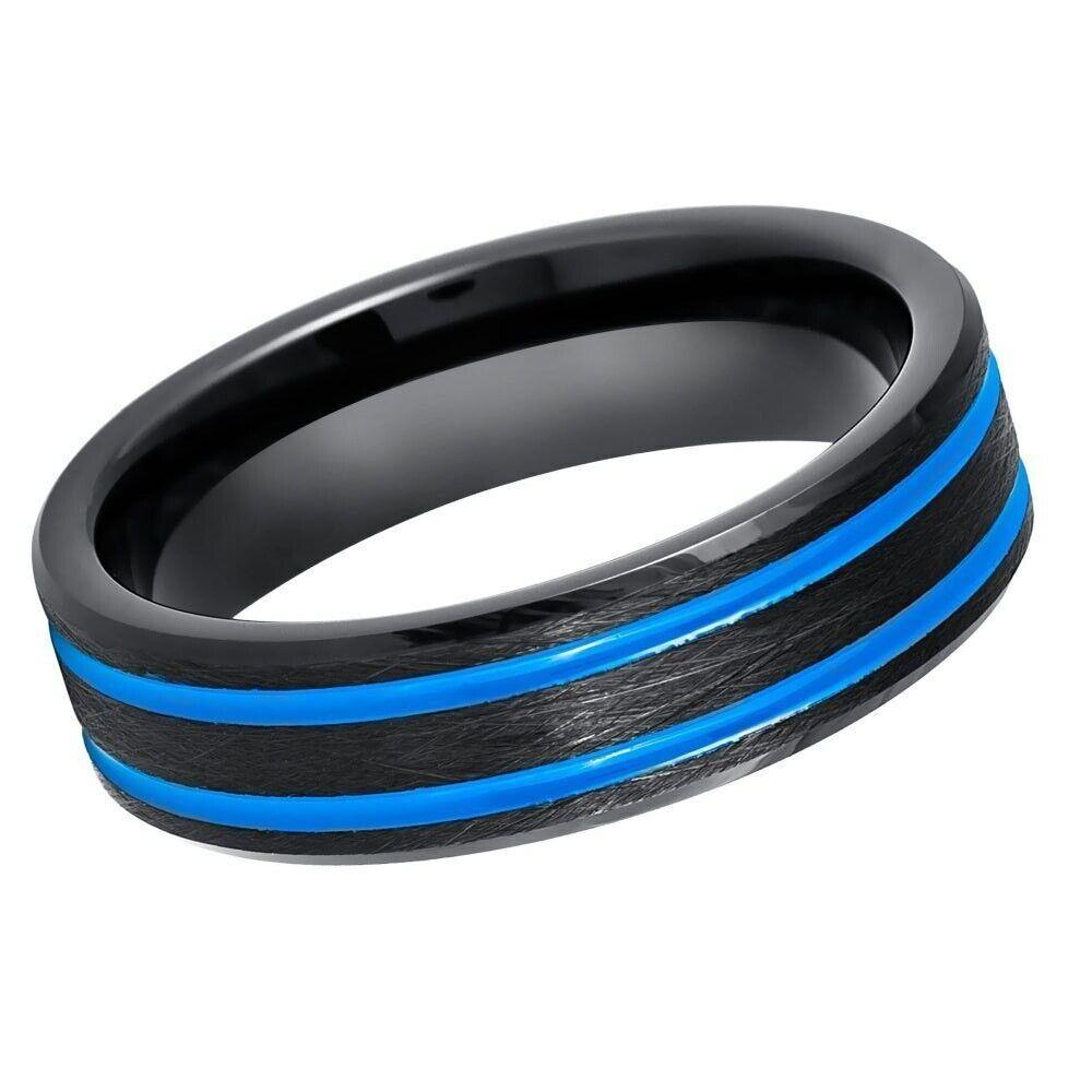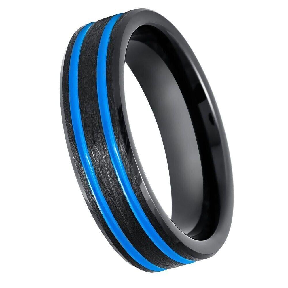 TThe 6mm width adds a sleek and comfortable fit to your finger. Whether you're looking for a fashionable accessory or a unique wedding band, this ring is sure to impress. The contrasting black and blue colors create a bold and eye-catching design.