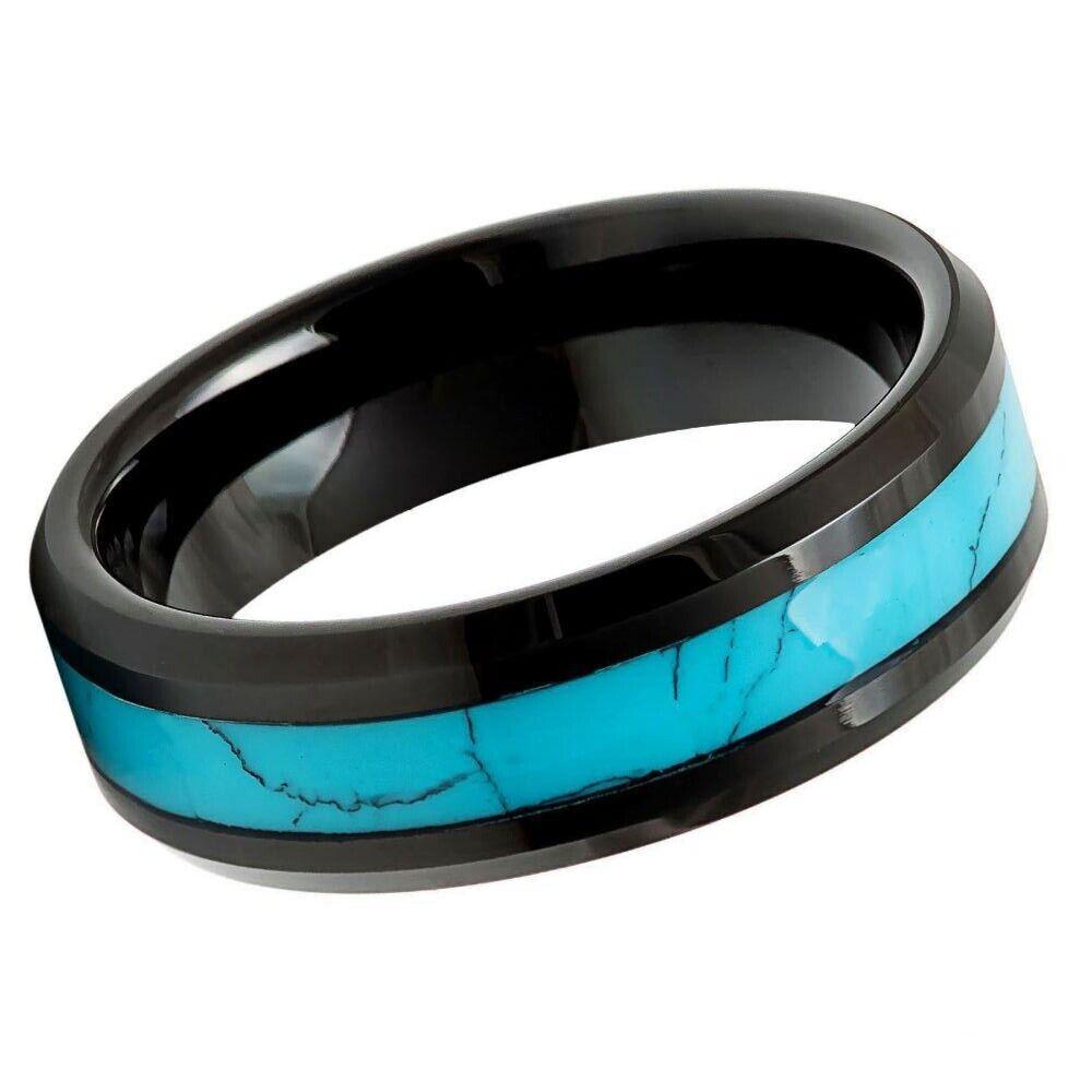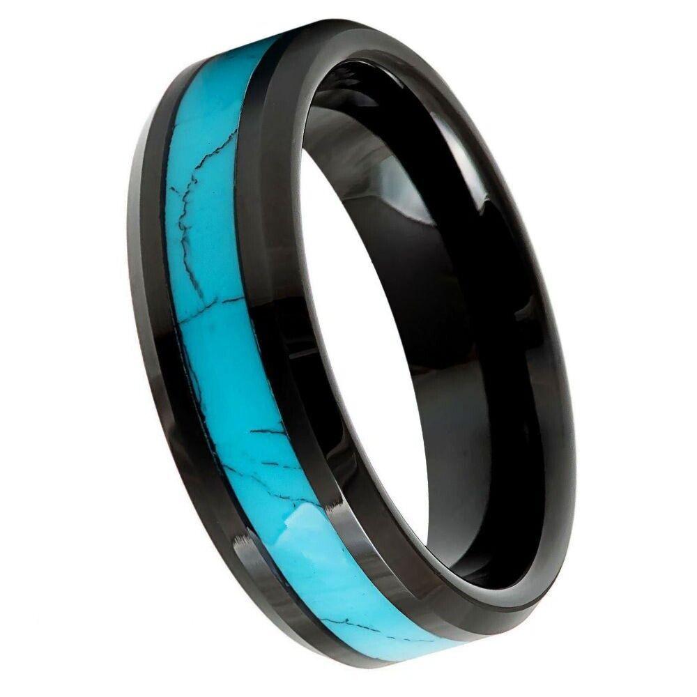 Make a Statement with Our 6mm Black IP Blue Turquoise Inlay Tungsten Ring