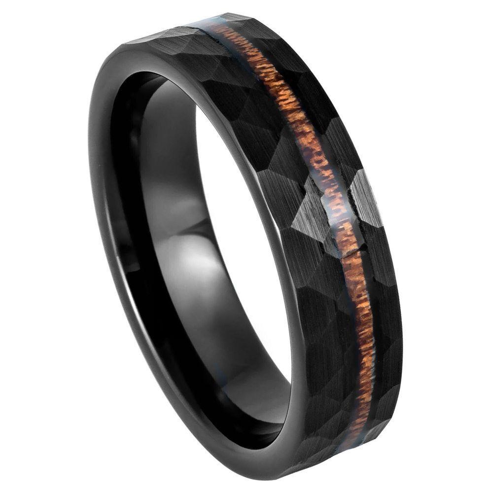 With its 8mm width, this ring offers a comfortable fit for daily wear or special occasions. Whether you're looking for a stylish everyday accessory or a meaningful wedding band, our Black IP Plated Hammered Tungsten Ring with Hawaiian Koa Wood Inlay is the perfect choice.