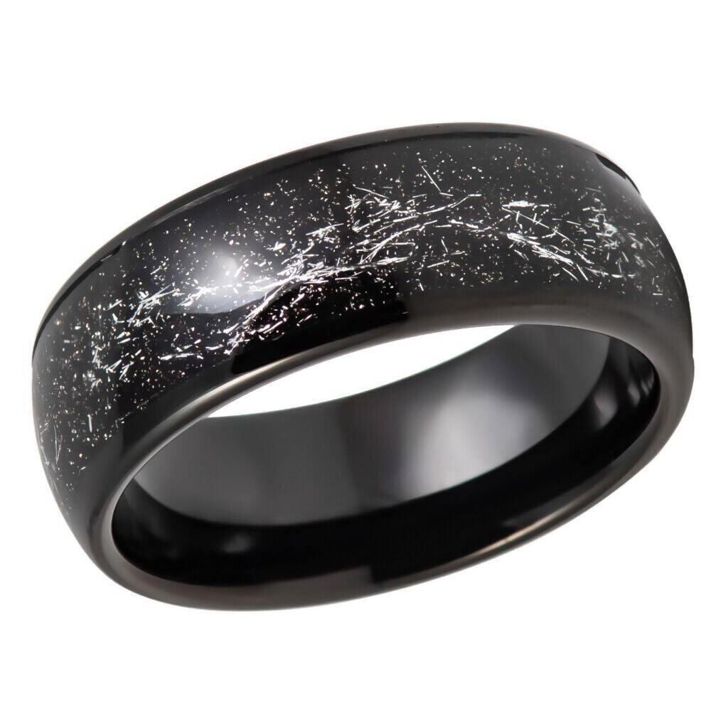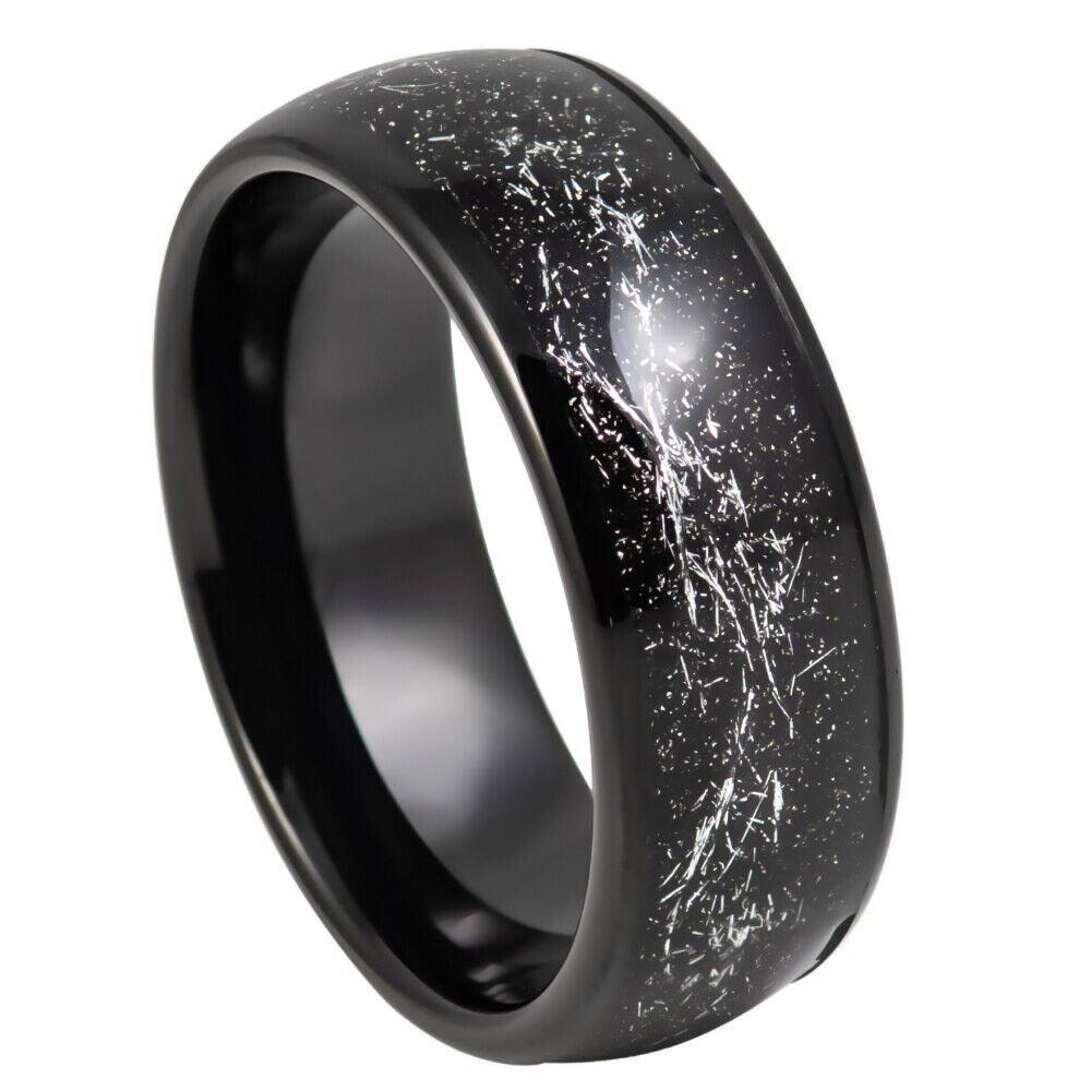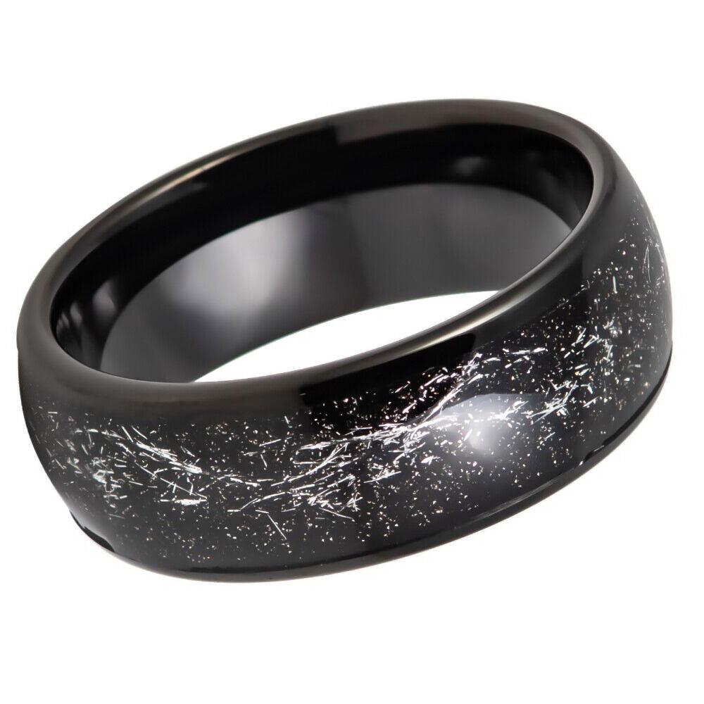 Make a Bold Statement with Our 8mm Black IP Inlay Meteorite Metallic Shavings Tungsten Ring