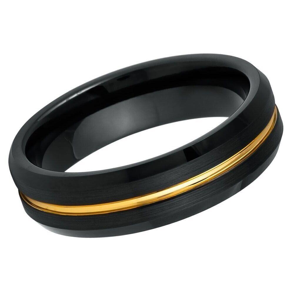 Whether you're looking for a stylish wedding band or a fashionable accessory, our Black IP Plated Yellow Gold Grooved Center Beveled Edge Tungsten Ring is a versatile choice. Embrace its unique design and make a statement wherever you go.
