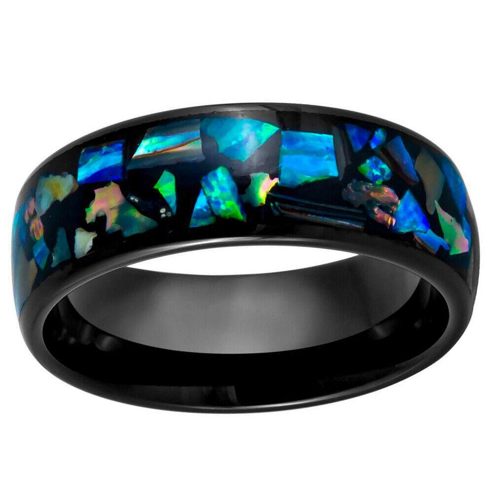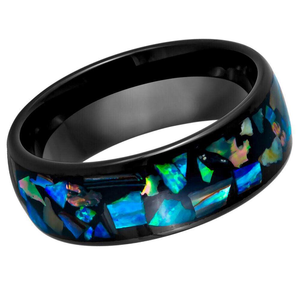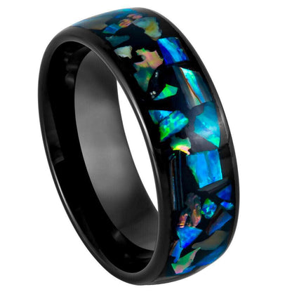 Experience the captivating beauty of our Tungsten Dome Black IP Simulated Opal & Abalone Fragments Inlay 8mm Band Ring. This exquisite ring showcases a domed design with a striking black IP coating that adds a touch of sophistication.