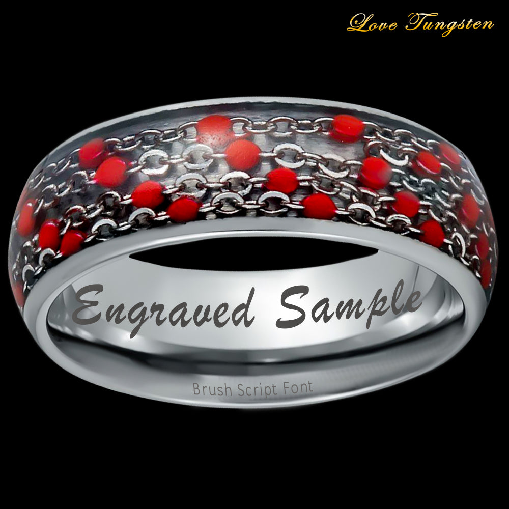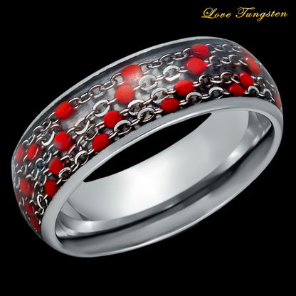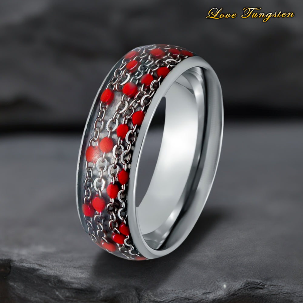 Experience the perfect blend of style and sophistication with our Dome Ring Cable Chain & Red Beads Inlay Tungsten Ring. The unique design features a domed shape and intricate cable chain with vibrant red bead inlay, creating a bold and eye-catching look.