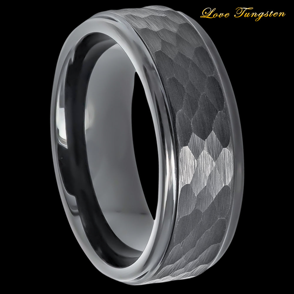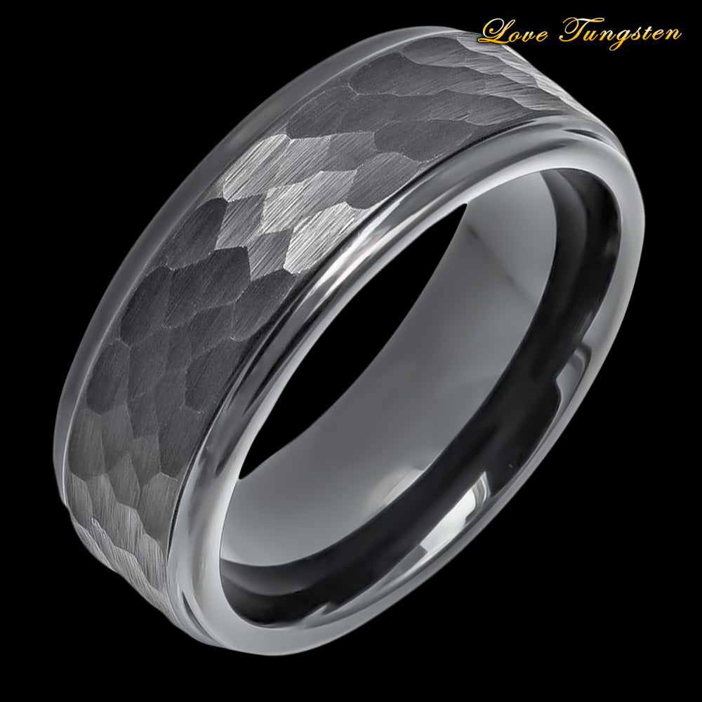 Shop now and add a touch of edgy elegance to your accessories collection with our Gun Metal IP Plated Hammered Center with Stepped Edge Tungsten Ring - 8mm.