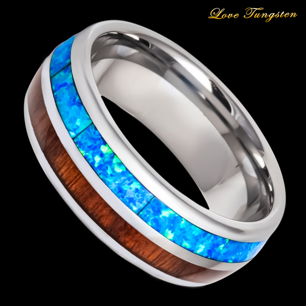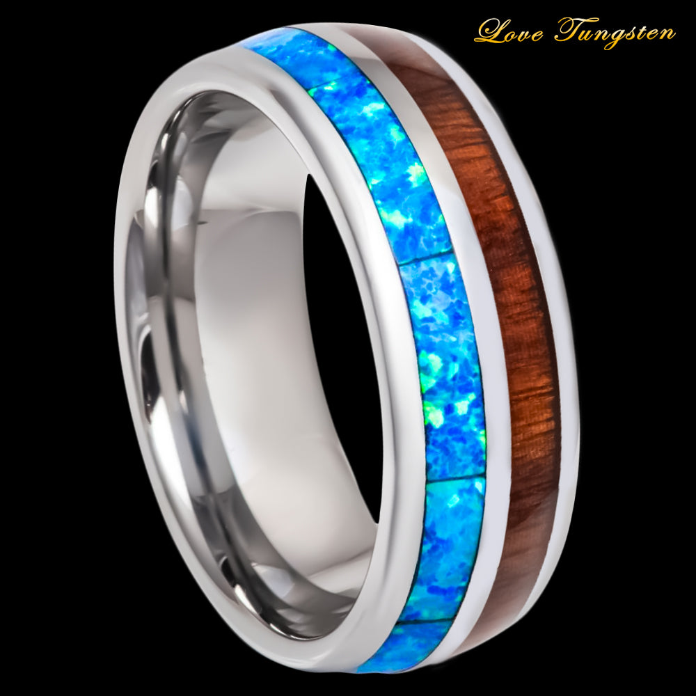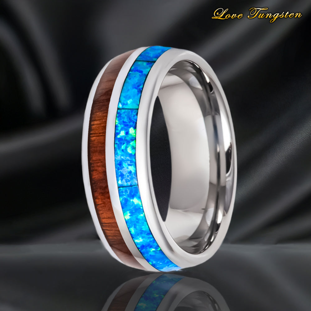 Embrace the unique and elegant style of our Koa Wood and Synthetic Blue Opal Inlay Domed Tungsten Ring - 8mm. Whether as a symbol of love and commitment or as a fashionable accessory, this ring is sure to make a statement.