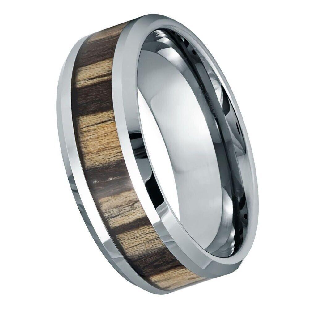 Elevate Your Style with our 8mm Unplated Zebra Wood Inlay Tungsten Ring