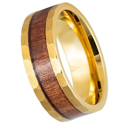 Hammered with Hawaiian Koa Wood Inlay Yellow IP Tungsten Ring - 8mm