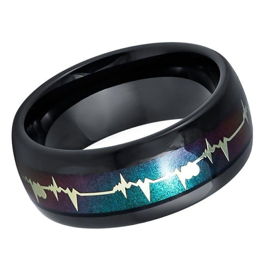 EKG Heartbeat Rainbow Gradient With Black IP Plated Tungsten Ring - 8mm