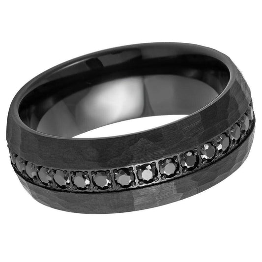 Hammered Eternity Black CZ Round-Cut Prong-Set Black IP Tungsten Ring - 8mm