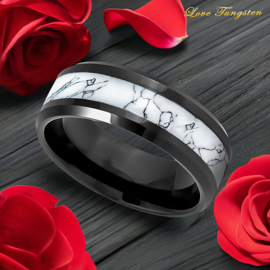 Bold White Turquoise Inlay Beveled Edge Tungsten Ring - 8mm