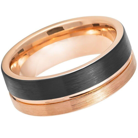 8mm Two-Tone Rose & Black IP Grooved Tungsten Ring | Modern & Durable Design