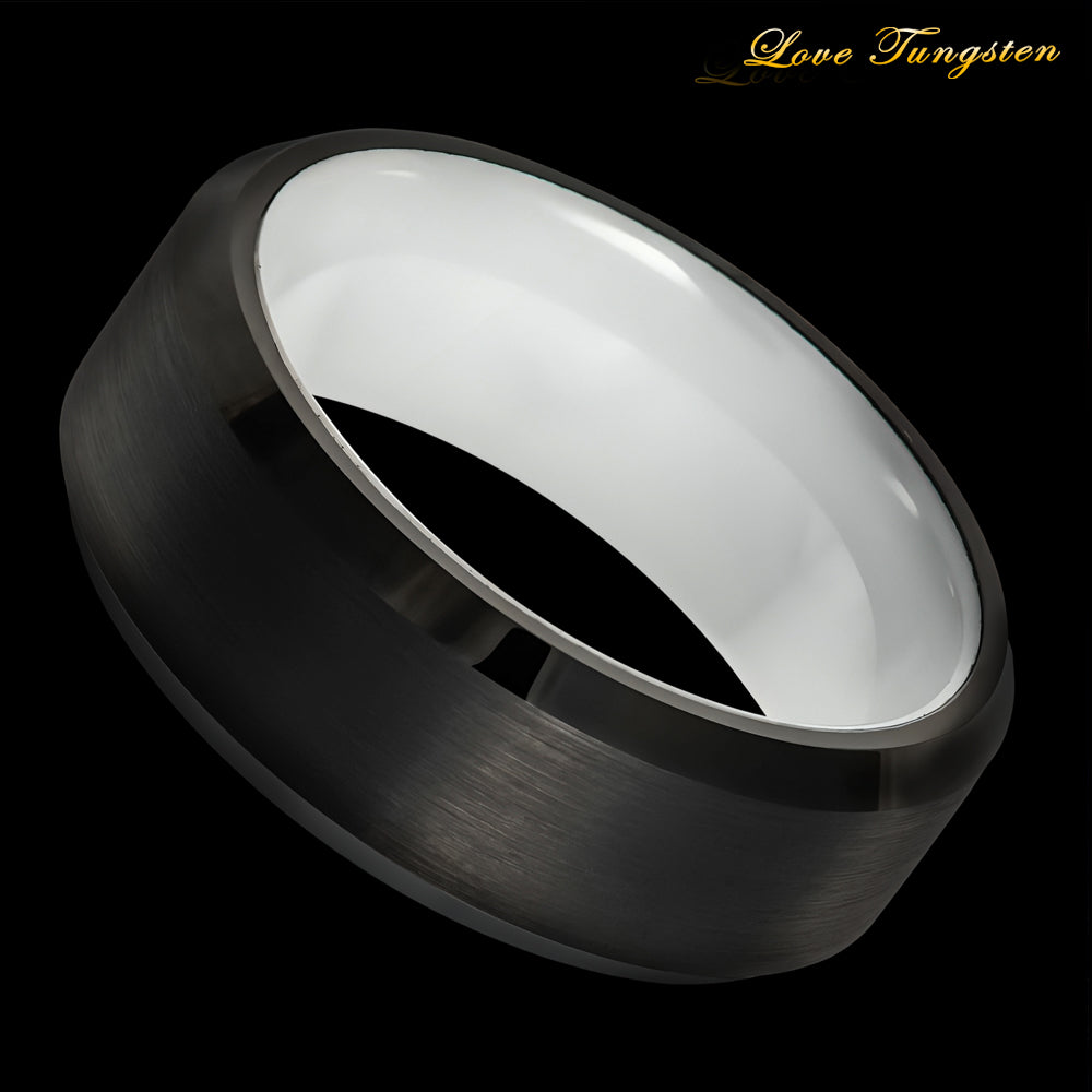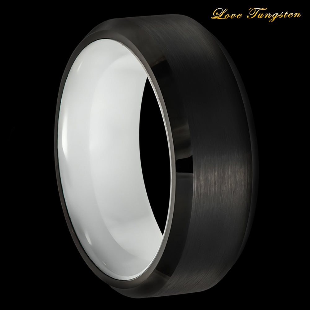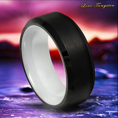 8mm Black IP Tungsten Ring with Beveled Edge & White Ceramic Sleeve | Modern & Durable Design