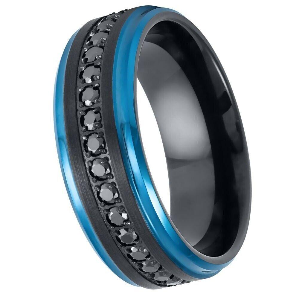 Make a Statement with Our 8mm Black IP Tungsten Ring: Blue Edges and CZ Eternity Design