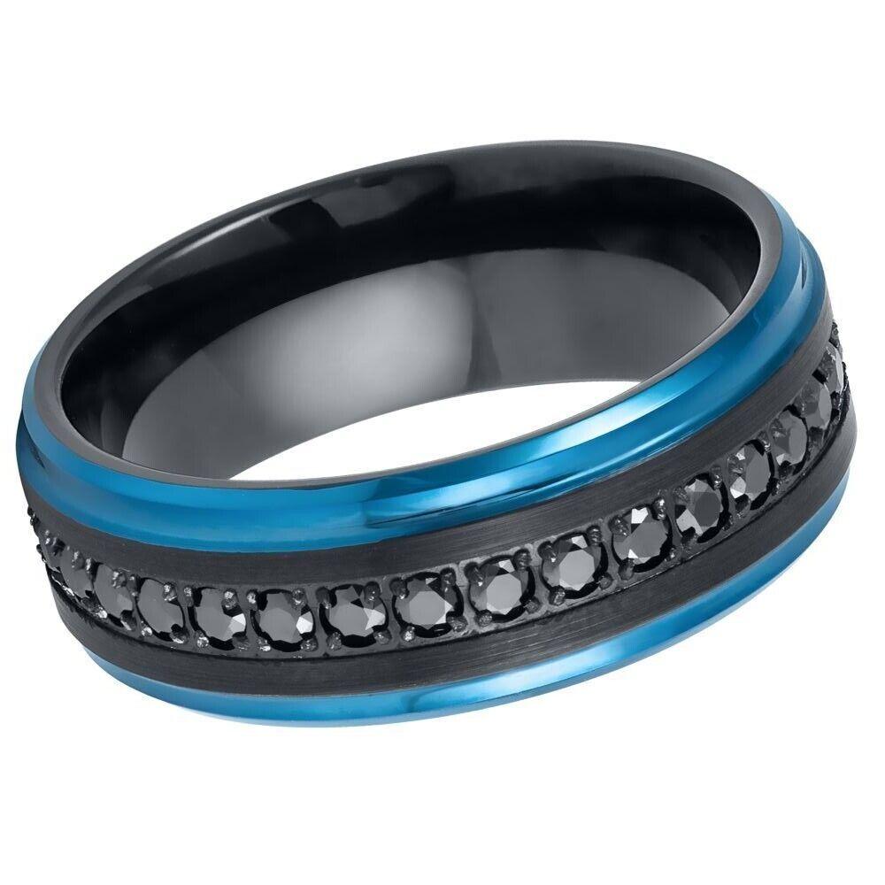 Experience the bold and stylish design of our 8mm Black IP Plated Tungsten Ring with Blue Edges and Black Round CZ Eternity. The black IP plating adds a sleek and modern touch, while the blue edges provide a vibrant and eye-catching contrast.