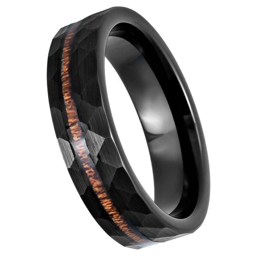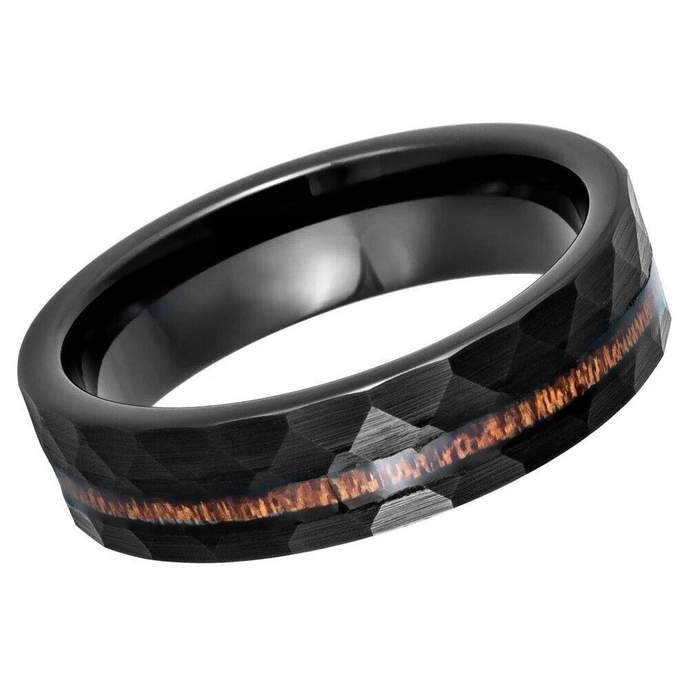 With its 8mm width, this ring offers a comfortable fit for daily wear or special occasions. Whether you're looking for a stylish everyday accessory or a meaningful wedding band, our Black IP Plated Hammered Tungsten Ring with Hawaiian Koa Wood Inlay is the perfect choice.