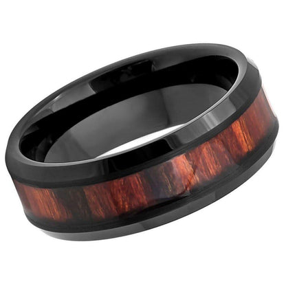 Make a Statement with Our 8mm Black IP Tungsten Ring: Beveled Edge, Mahogany Wood Inlay