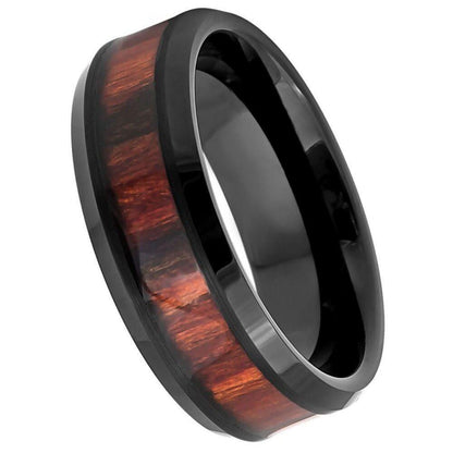 Dark Mahogany Wood Inlay Beveled Edge Black IP Tungsten Ring – 8 mm
