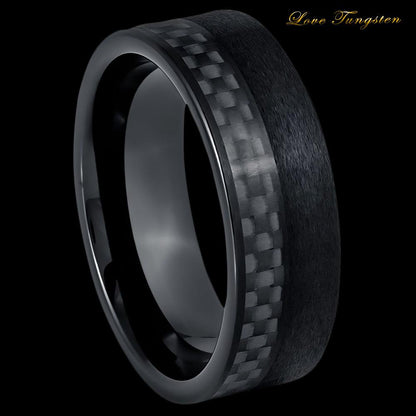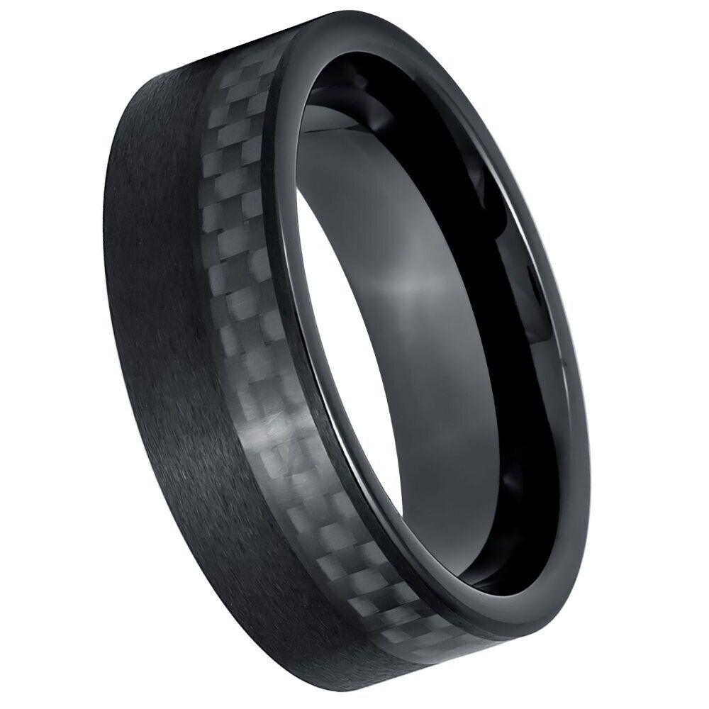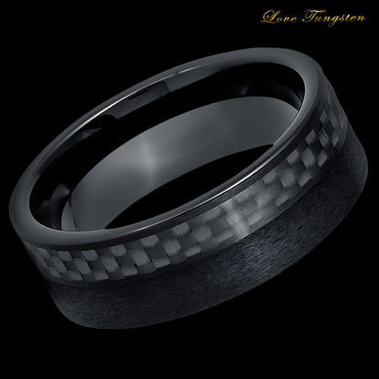 Make a Statement with Our Black IP Plated & Carbon Fiber Inlay Tungsten Ring - 8mm