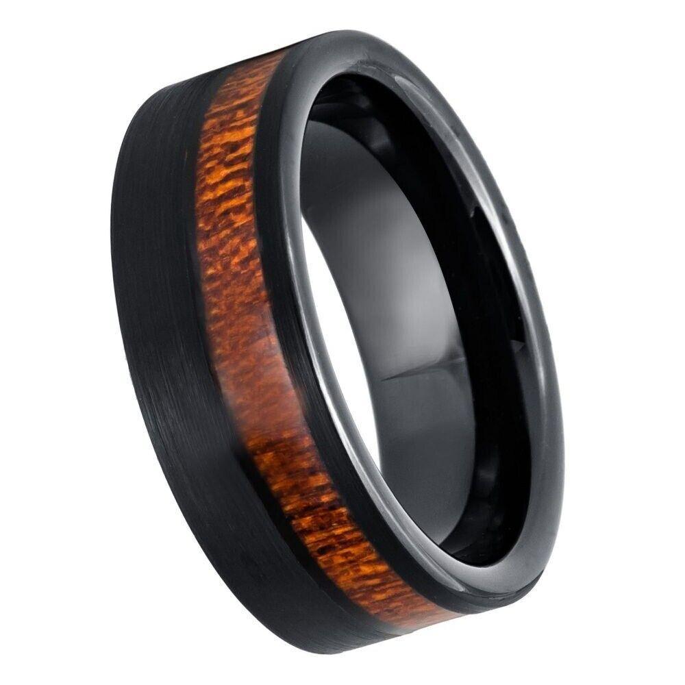 Discover the Beauty of our 8mm Black IP Plated & Koa Wood Inlay Tungsten Ring