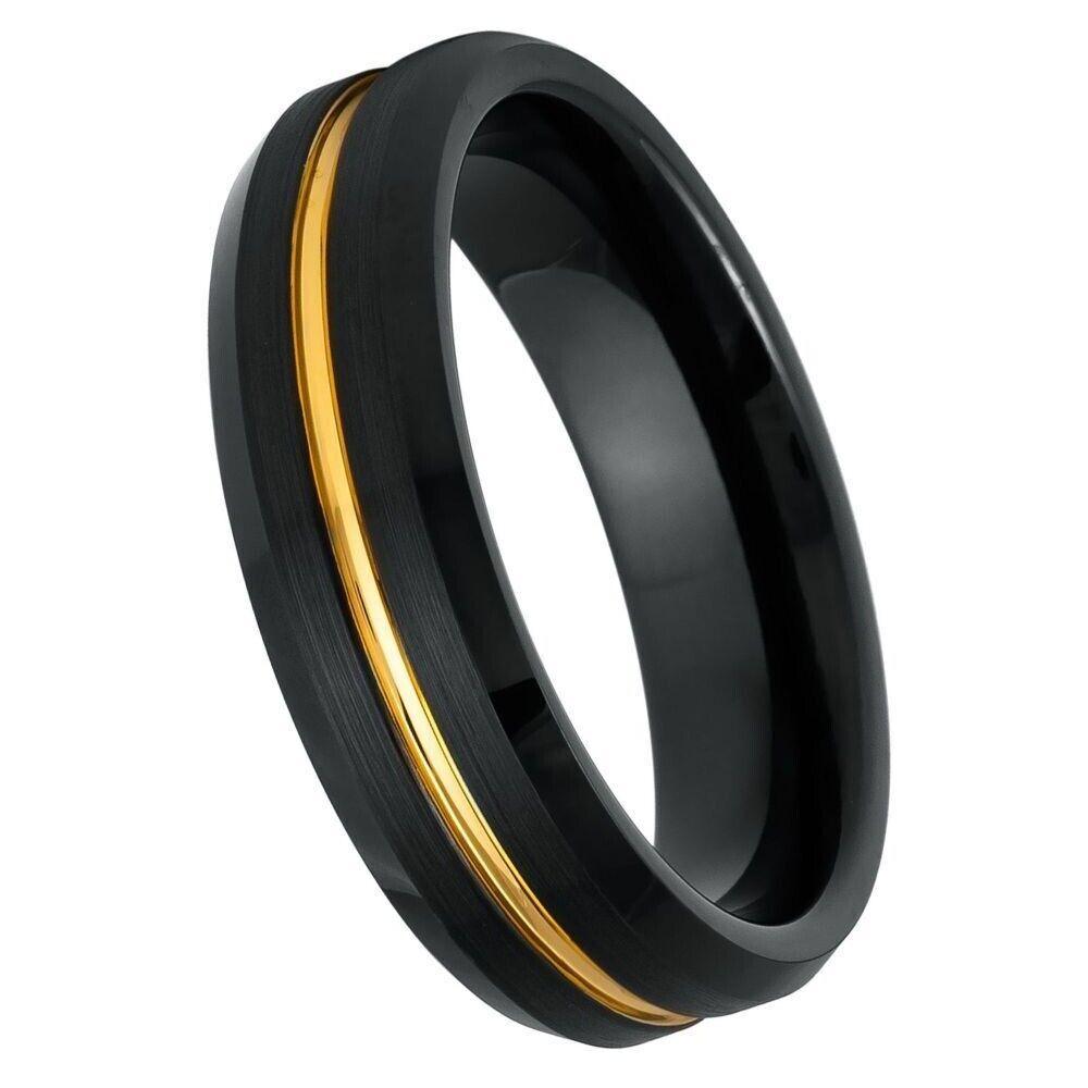 Whether you're looking for a stylish wedding band or a fashionable accessory, our Black IP Plated Yellow Gold Grooved Center Beveled Edge Tungsten Ring is a versatile choice. Embrace its unique design and make a statement wherever you go.