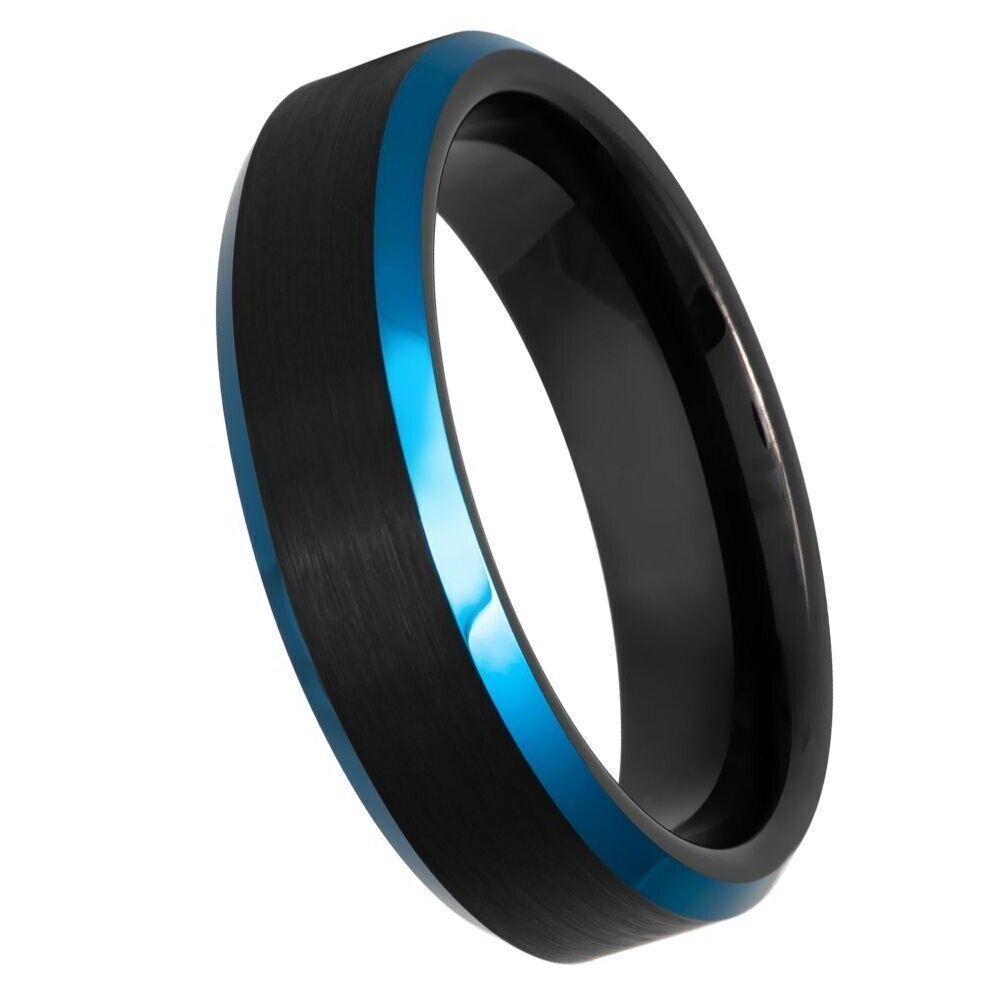 Make a Statement with Our 6mm Black IP Tungsten Ring: Blue IP Beveled Edge