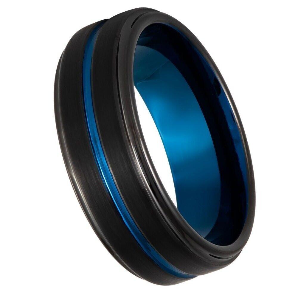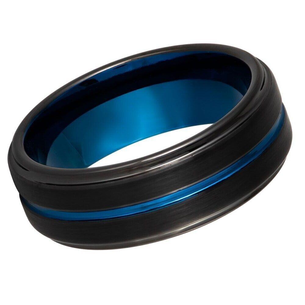 Blue Grooved Center Stepped Edge with Black IP Tungsten Ring - 8mm
