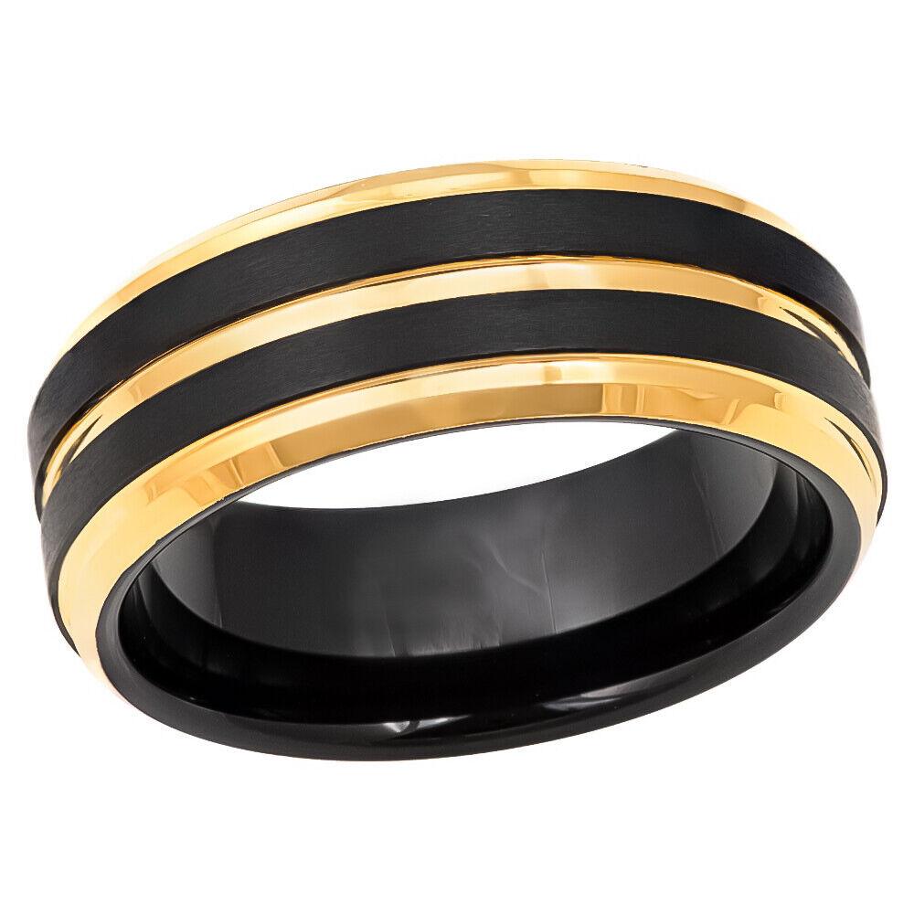 Shop now and elevate your style with this 8mm Black & Yellow Plated Tungsten Ring. Make a statement with its striking design and show off your unique sense of fashion.