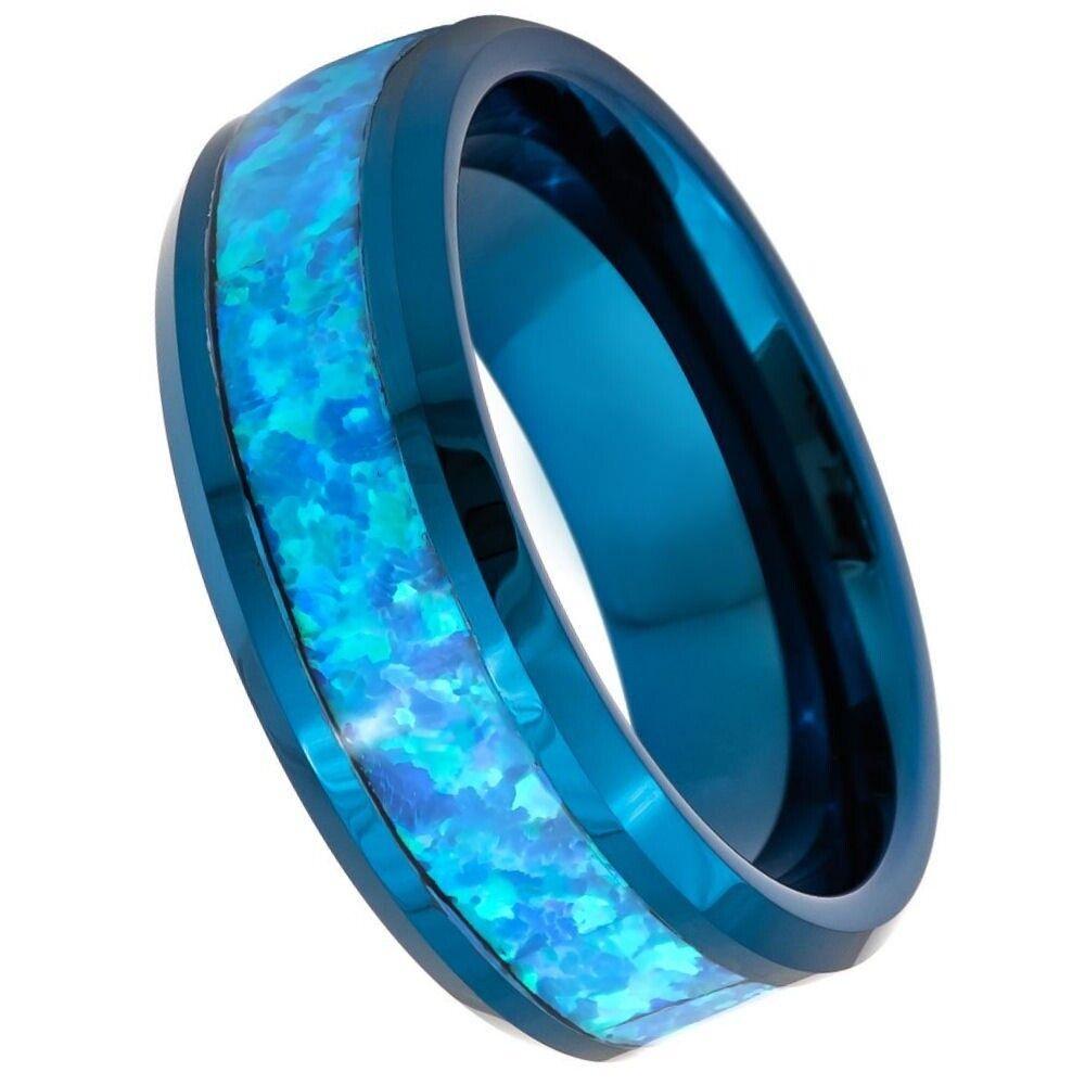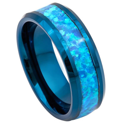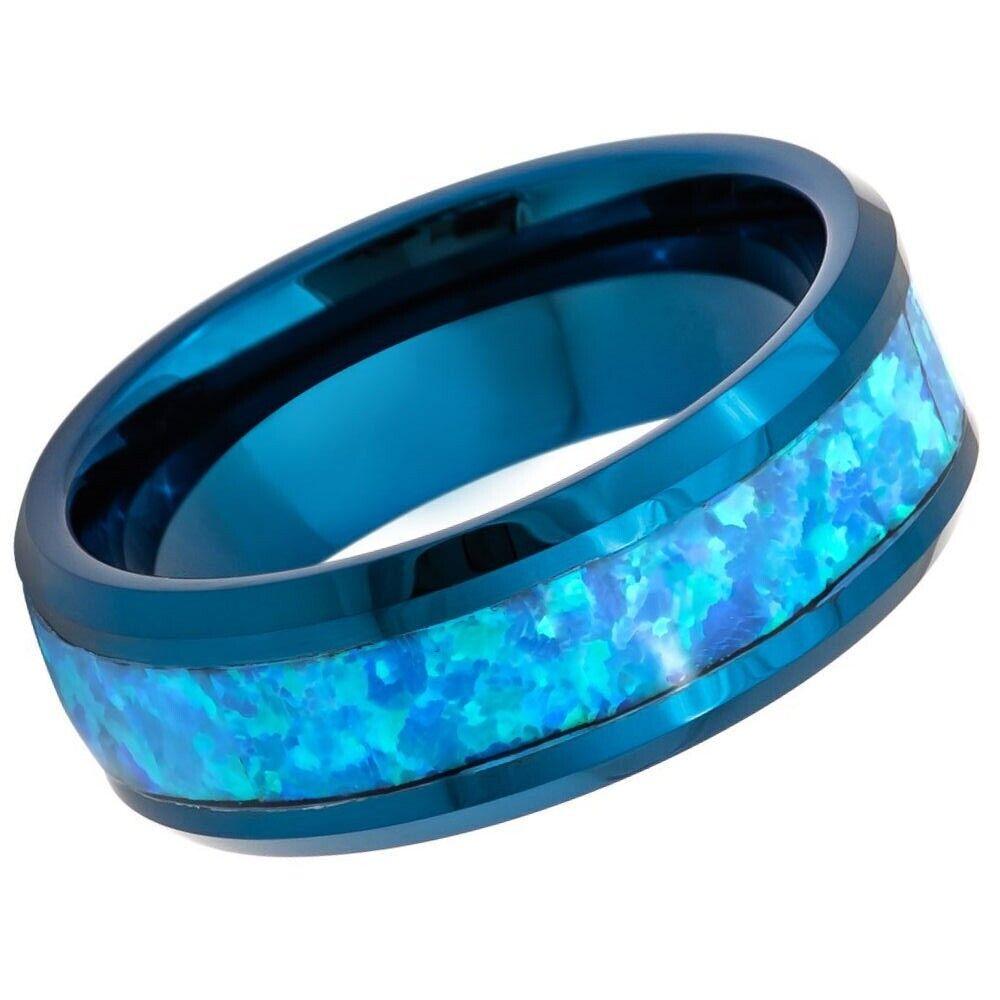 Experience the Radiant Beauty of Our Blue IP Plated Opal Inlay Tungsten Ring - 8mm