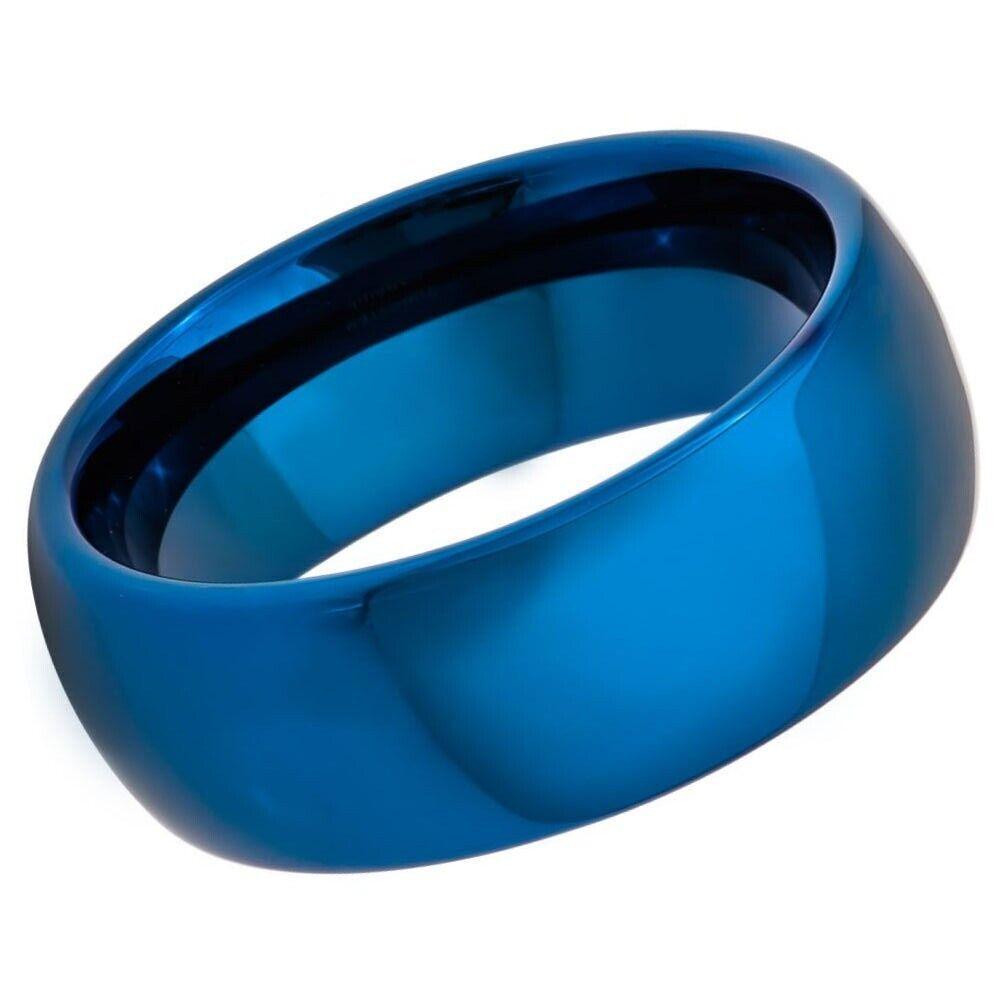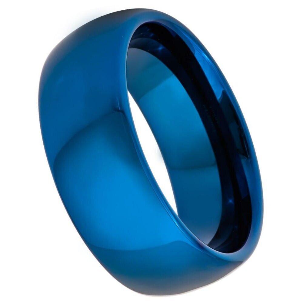 Make a Statement with Our 8mm Domed Blue IP Tungsten Ring: Shiny Finish and Bold Style