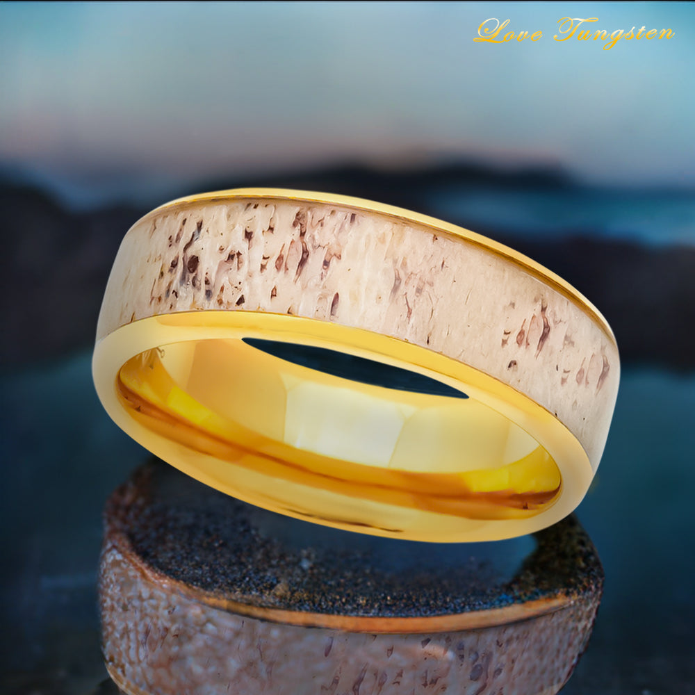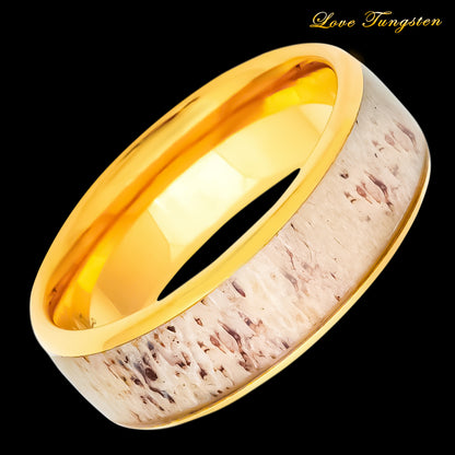 Deer Antler Inlay Domed Yellow Gold IP Tungsten Ring - 8mm
