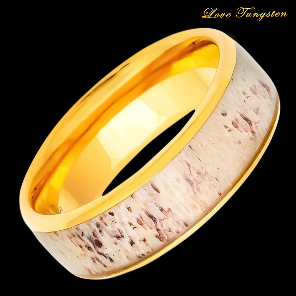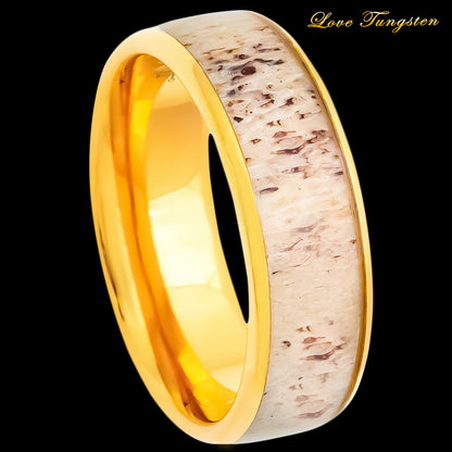 Make a Statement with Our Deer Antler Inlay Domed Yellow Gold IP Tungsten Ring in 8mm
