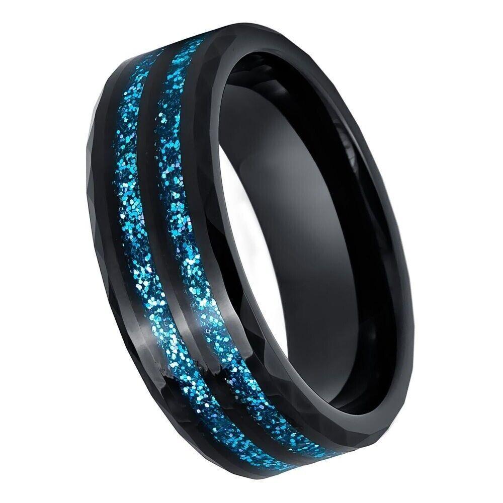 Make a Statement with our Black IP Plated Faceted Finish Blue Glitter Inlay Tungsten Ring - 8mm