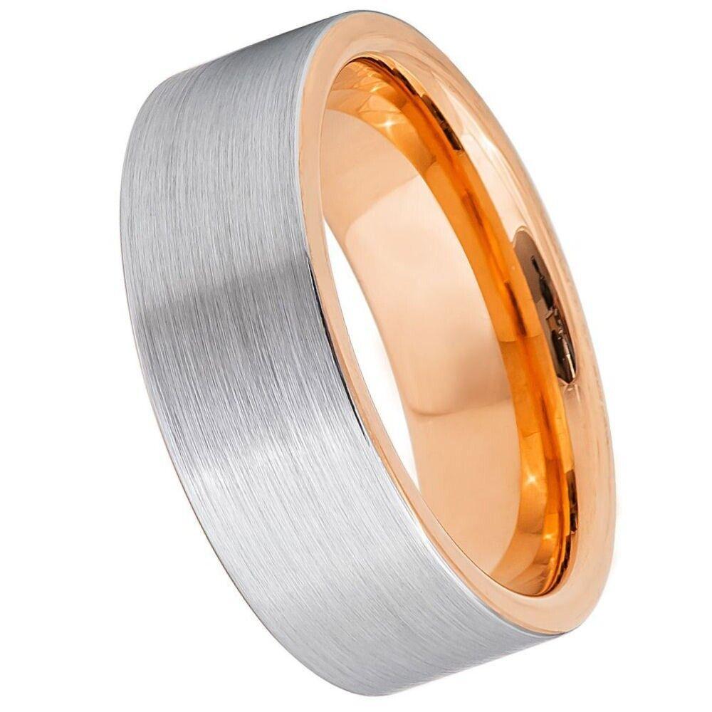 Shop now and elevate your style with our 8mm Pipe Cut Rose Gold IP Plated Inside and White IP Brushed Tungsten Ring. Make a statement with this striking piece that combines modern design and timeless appeal.