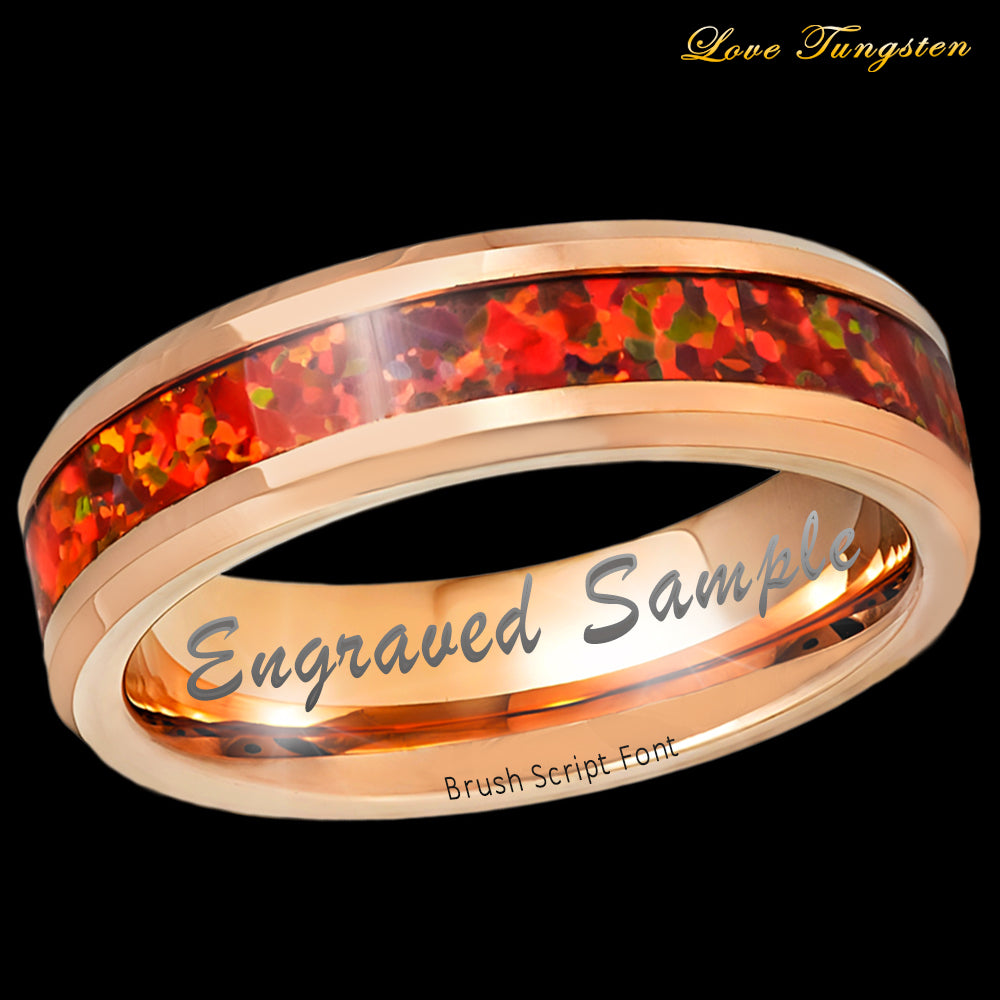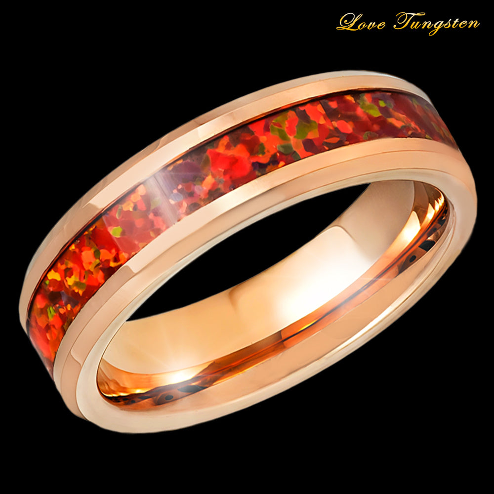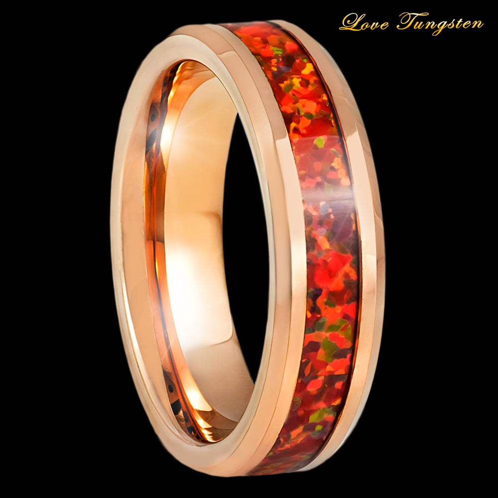 Ignite Your Style with the Rose Gold IP Red Fire Opal Inlay Tungsten Ring - 6mm.