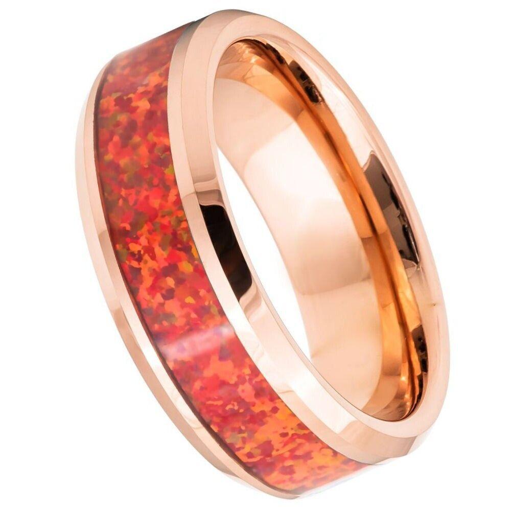 Make a Bold Statement with Our 8mm Rose Gold IP Tungsten Ring: Red Fire Opal Inlay