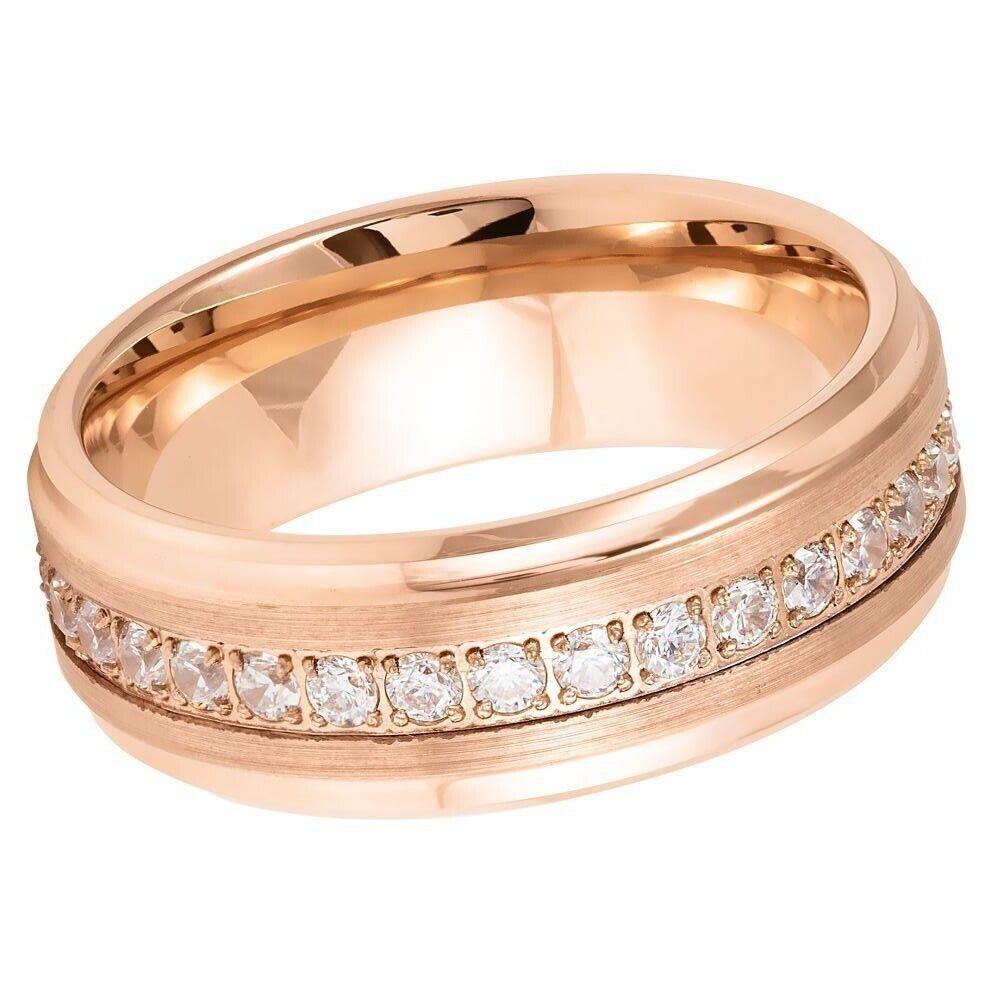 Experience the elegance of our 8mm Rose Gold IP Plated White CZ Round Cut Eternity Tungsten Ring. The rose gold IP plating adds a touch of luxury and sophistication, while the round cut white CZ stones create a sparkling and timeless look.