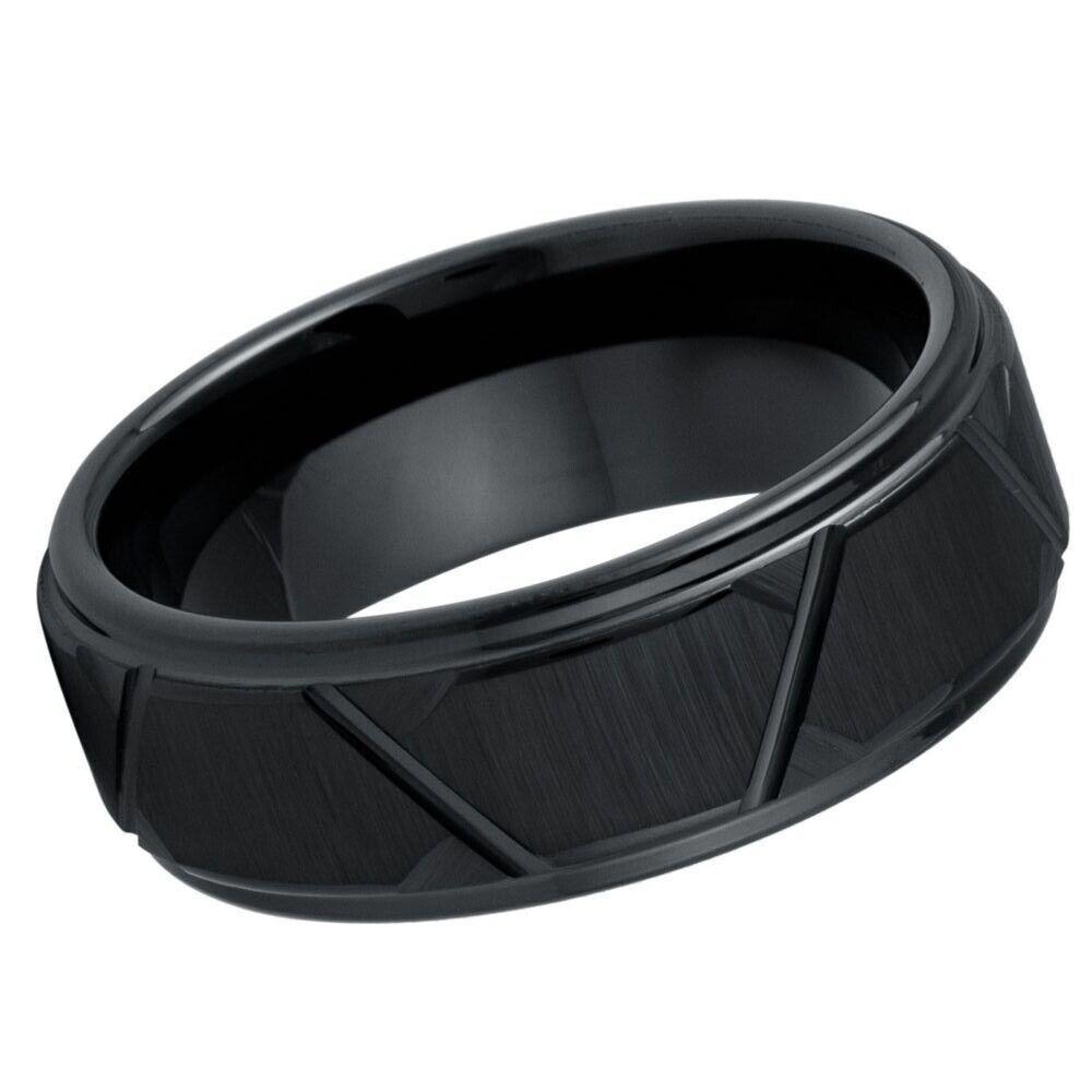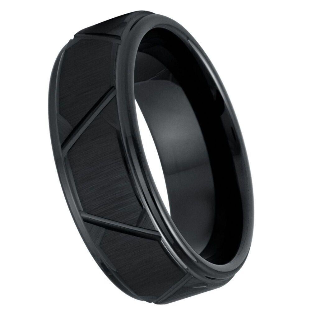 Make a Bold Statement with Our 8mm Black IP Plated Trapezoids Design Tungsten Ring