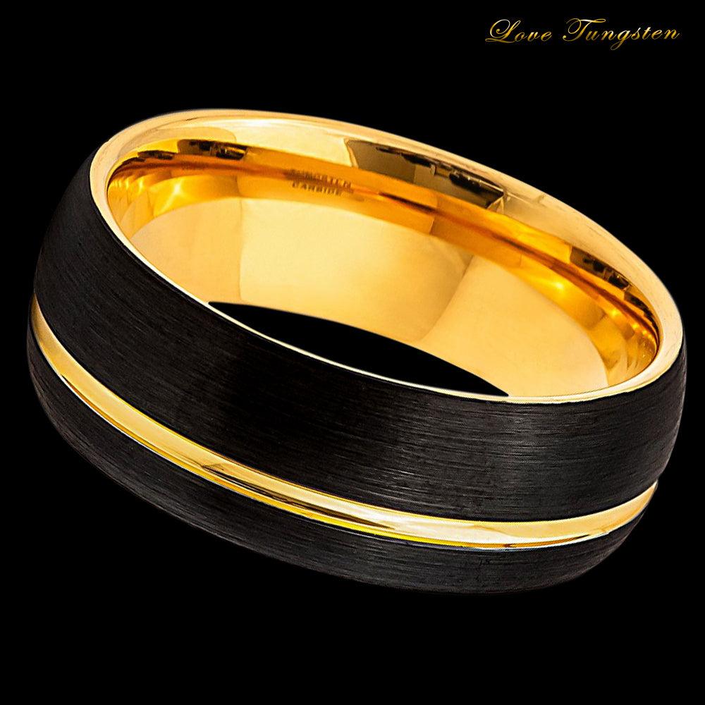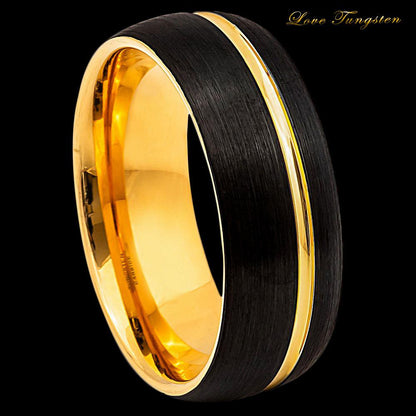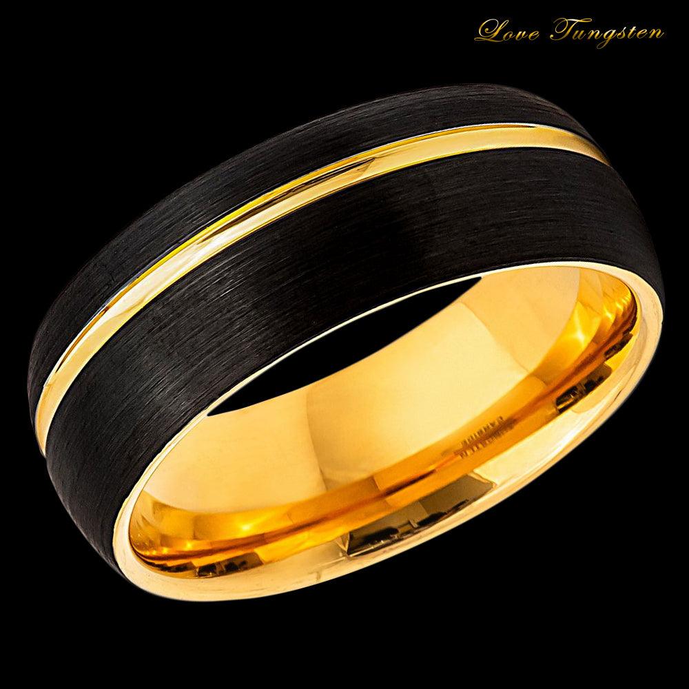 Shop now and elevate your style with our 8mm Two-tone Brushed Yellow Gold & Black IP Plated Groove Tungsten Ring. It's a perfect choice for those who appreciate unique and eye-catching jewelry.
